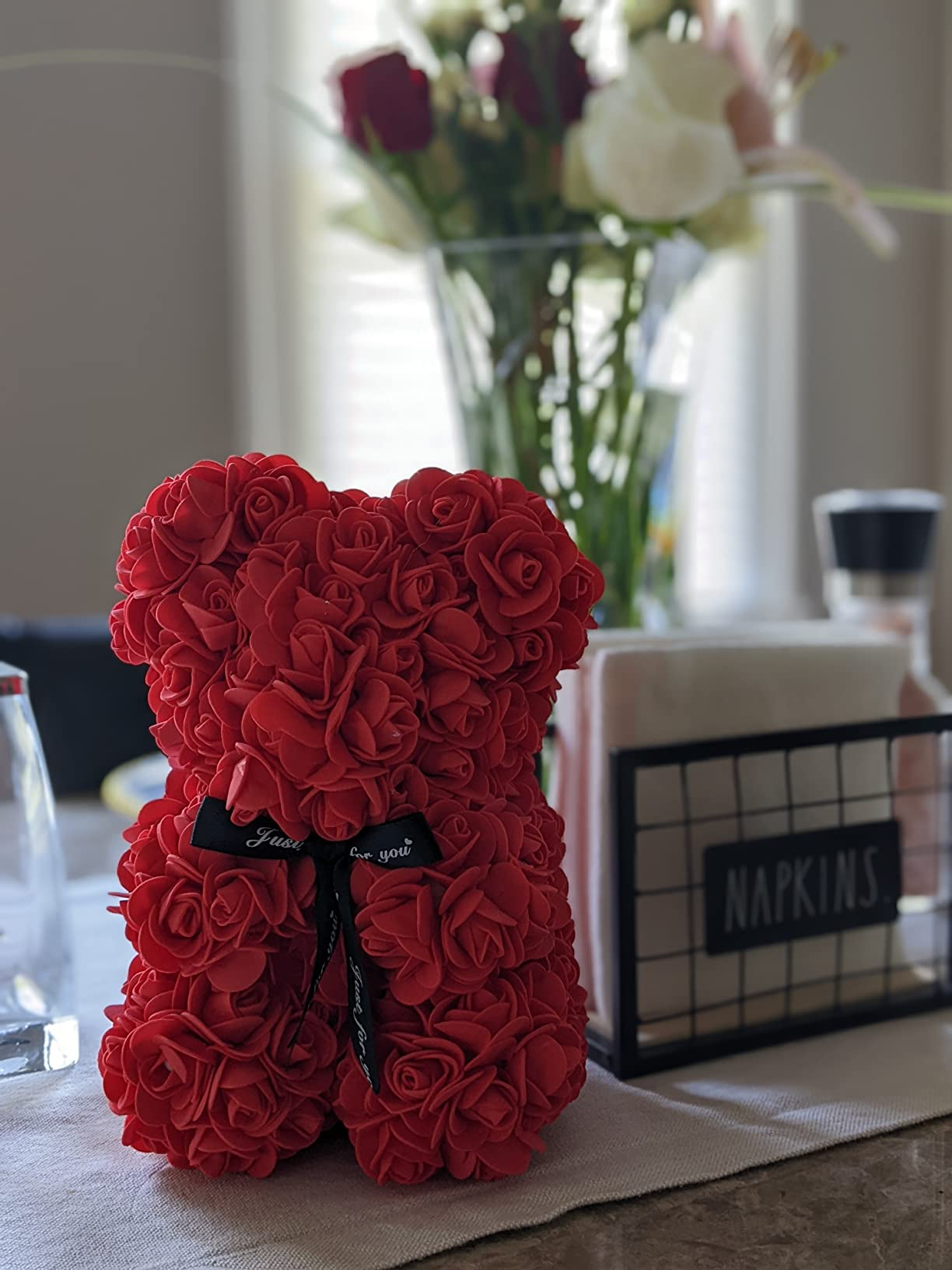 It's super easy! Keep it away from direct sunlight, water, and high humidity. Gently dust with a soft brush or blow-dry on cool/low setting if needed. Avoid touching the roses too much to preserve their delicate beauty. With simple care, your eternal rose teddy will stay stunning for years — a forever keepsake! 🌸💕
